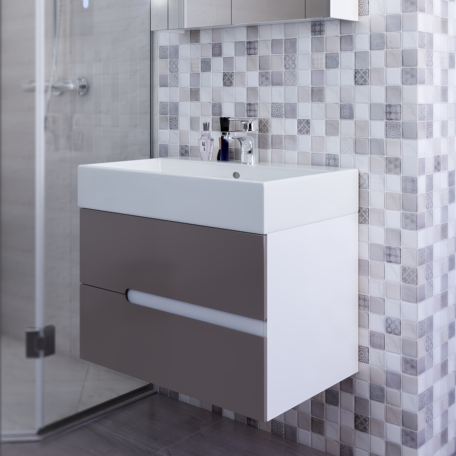 Шкафът се доставя сглобен и готов за монтаж с всички необходими крепежни елементи. Поради големината и тежестта, мивката е опакована отделно.