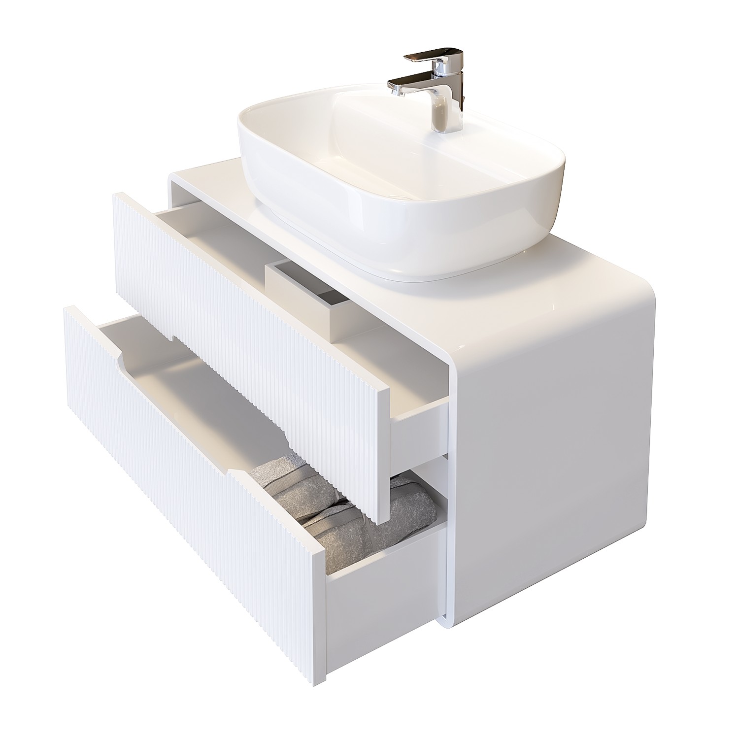 Шкафът се доставя сглобен и готов за монтаж с всички необходими крепежни елементи. Поради големината и тежестта, мивката е опакована отделно.