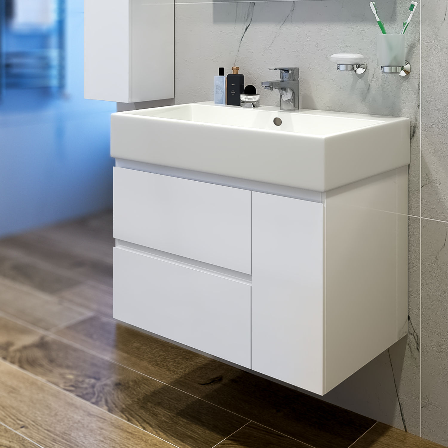 Шкафът се доставя сглобен и готов за монтаж с всички необходими крепежни елементи. Поради големината и тежестта, мивката е опакована отделно.