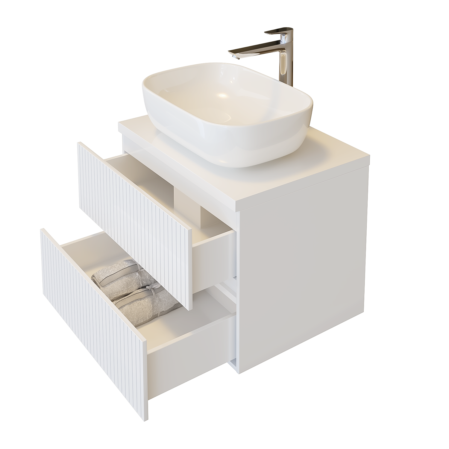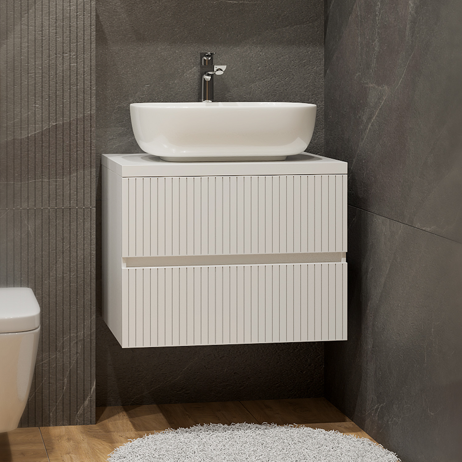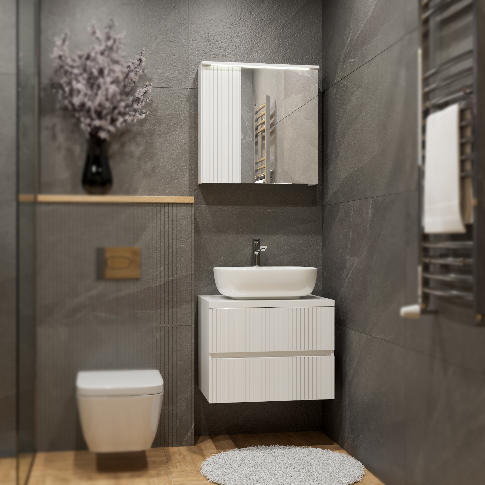 Стилен шкаф за баня с модерен фрезован дизайн от вертикални линии, който придава характер на пространството. Изчистената визия и висококачествената изработка го правят отличен избор за съвременни бани с усещане за елегантност и ред.