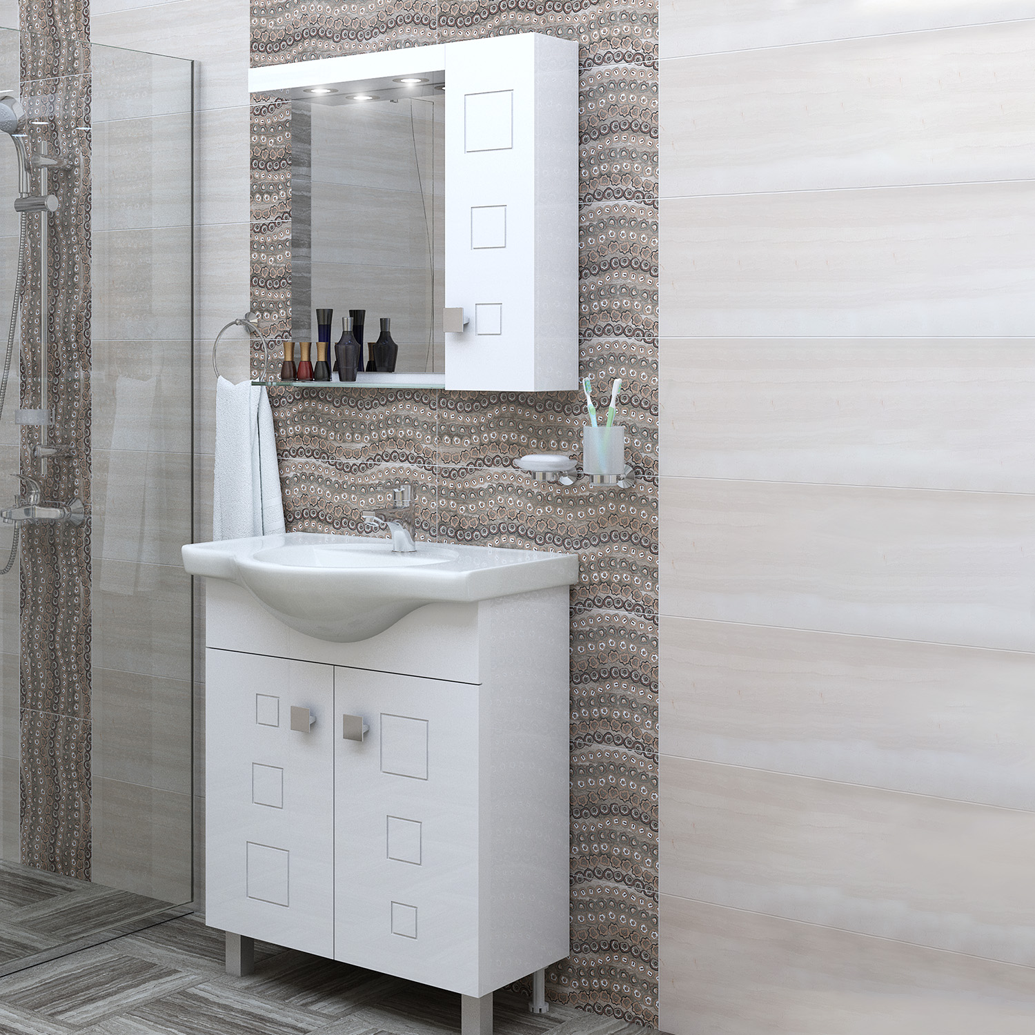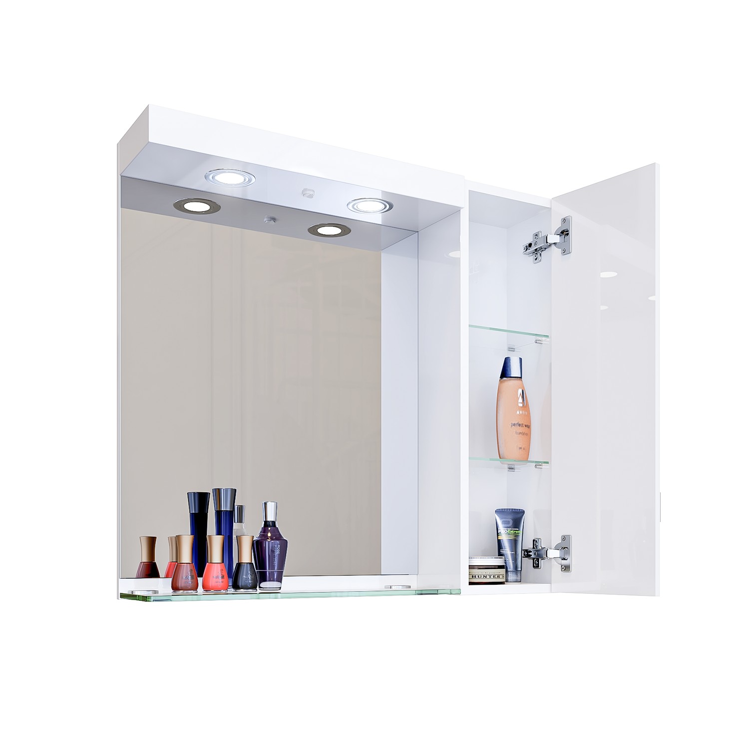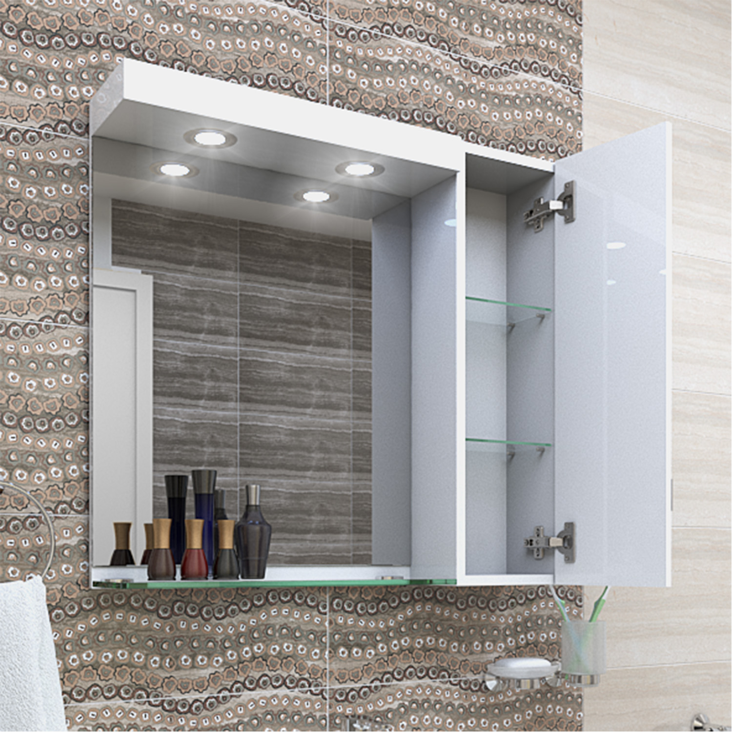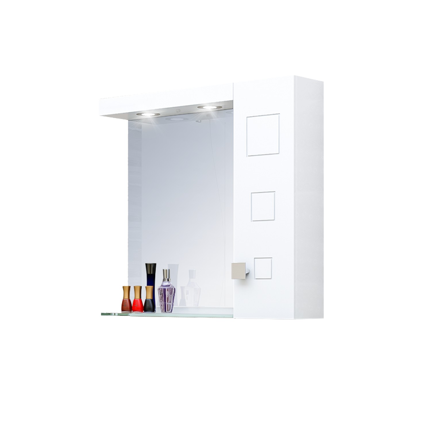 Практичен горен шкаф за баня с огледало с LED осветление и отделение с вратичка с декоративни елементи. Стъкленият рафт предлага допълнително пространство за козметика и тоалетни принадлежности.