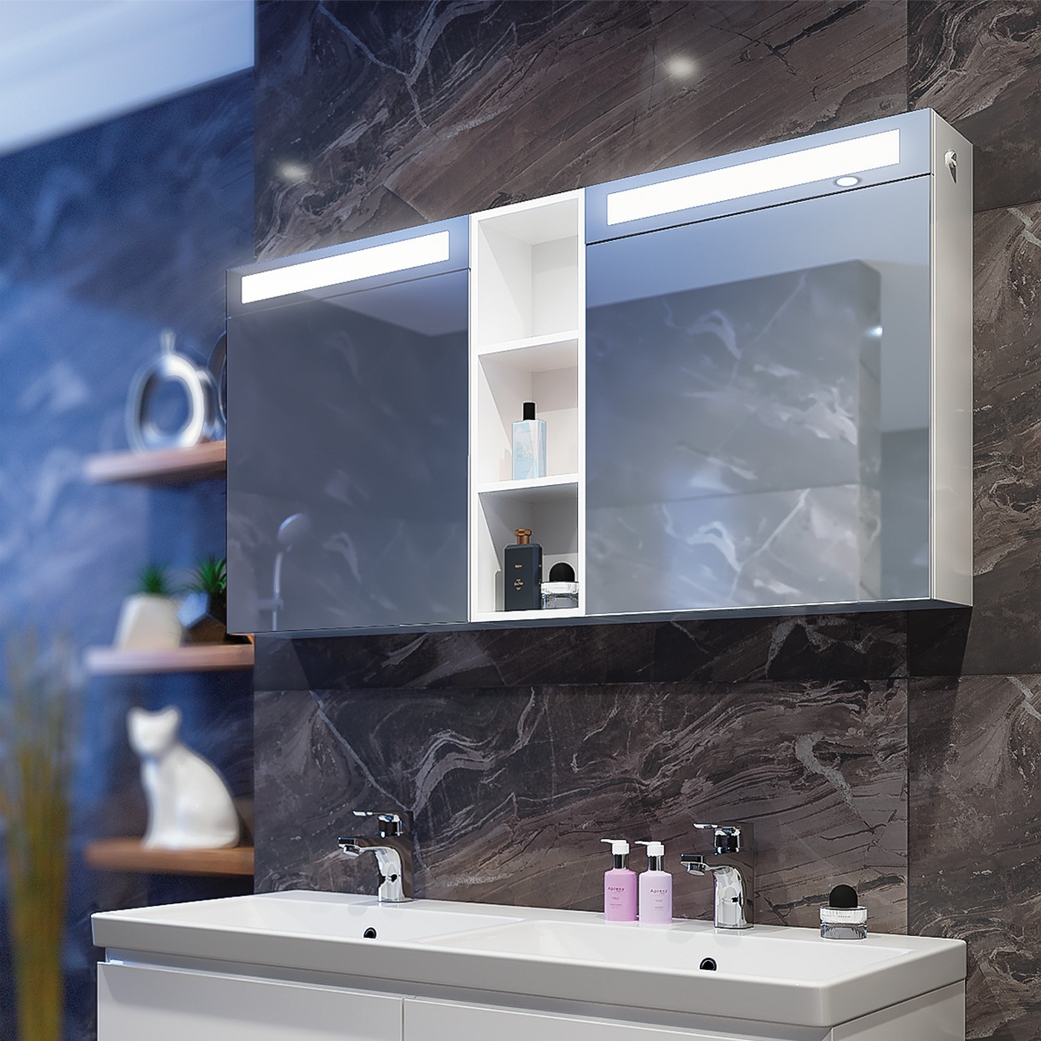 Двоен шкаф за баня с две врати с огледала и стъклени рафтове, които функционално разпределят пространството. Нишата с два рафта по средата предлага допълнително пространство за съхранение на козметика и тоалетни принадлежности. Вградено LED осветление.
