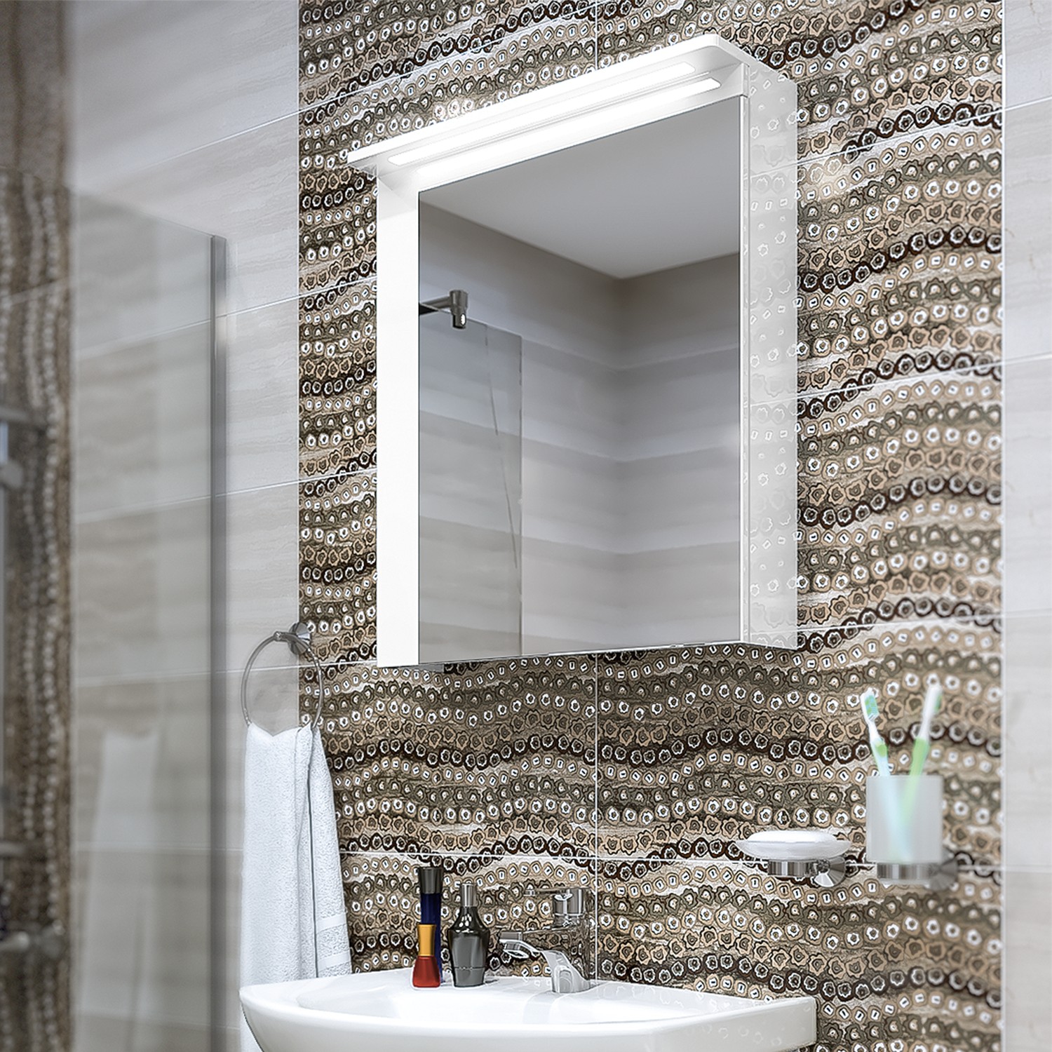 Практичен горен шкаф за баня с LED осветление. Eдна вратичка с огледало и един стъклен рафт, който функционално разпределя пространството за козметика и тоалетни принадлежности.