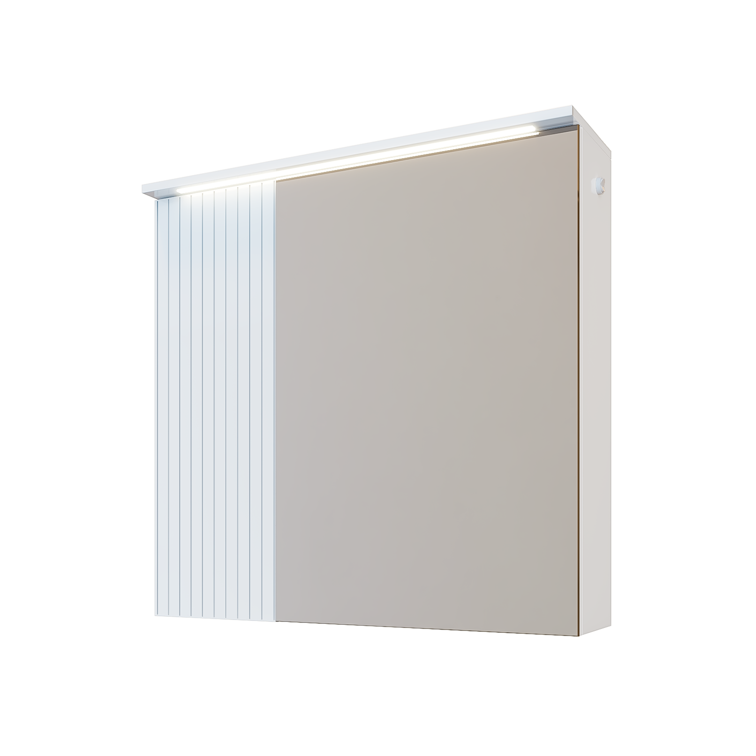 Стилен шкаф за баня с модерен фрезован дизайн от вертикални линии, който придава характер и текстура на пространството. Изчистената визия и висококачествената изработка го правят отличен избор за съвременни бани с усещане за елегантност и ред.