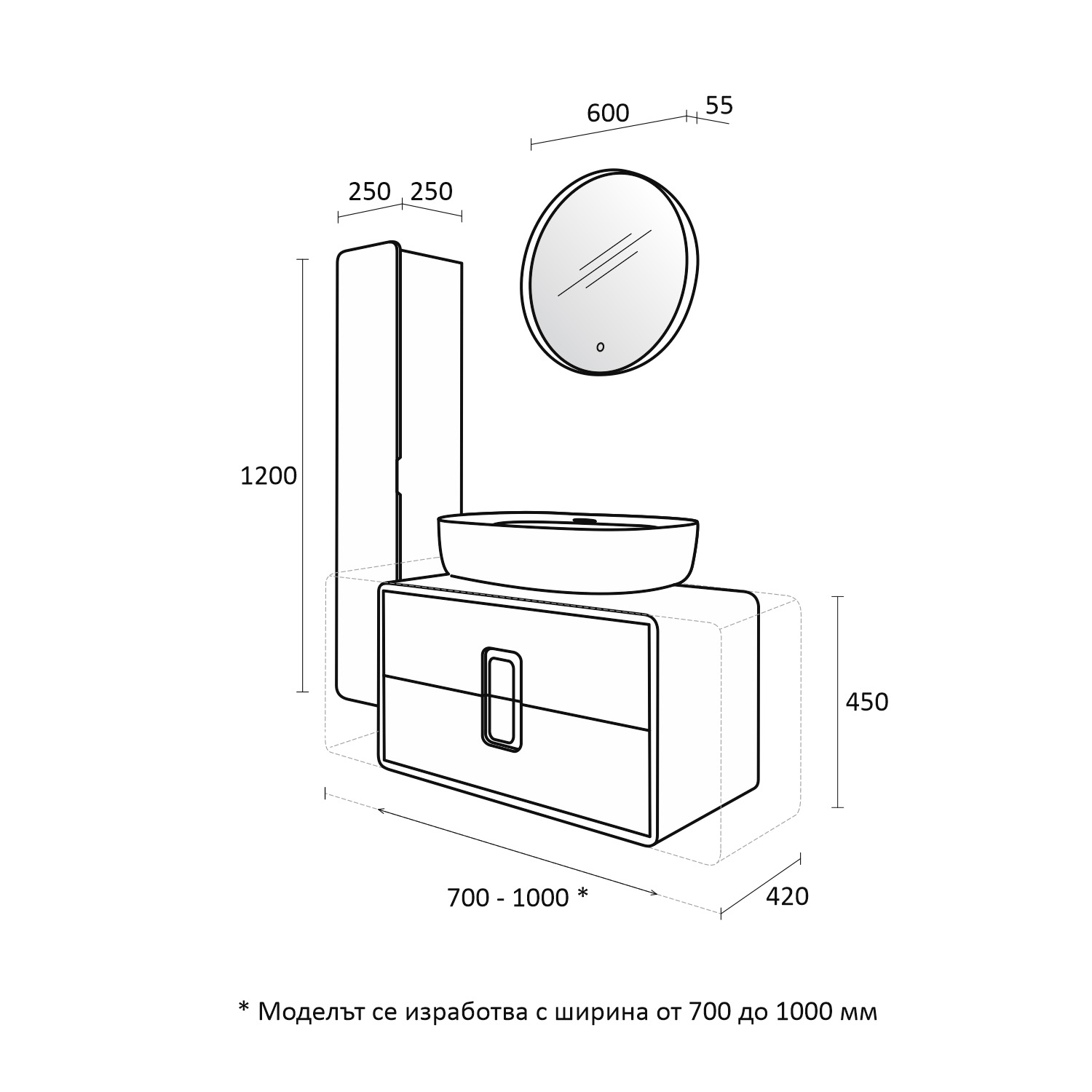 - Размери в мм: диаметър – 600