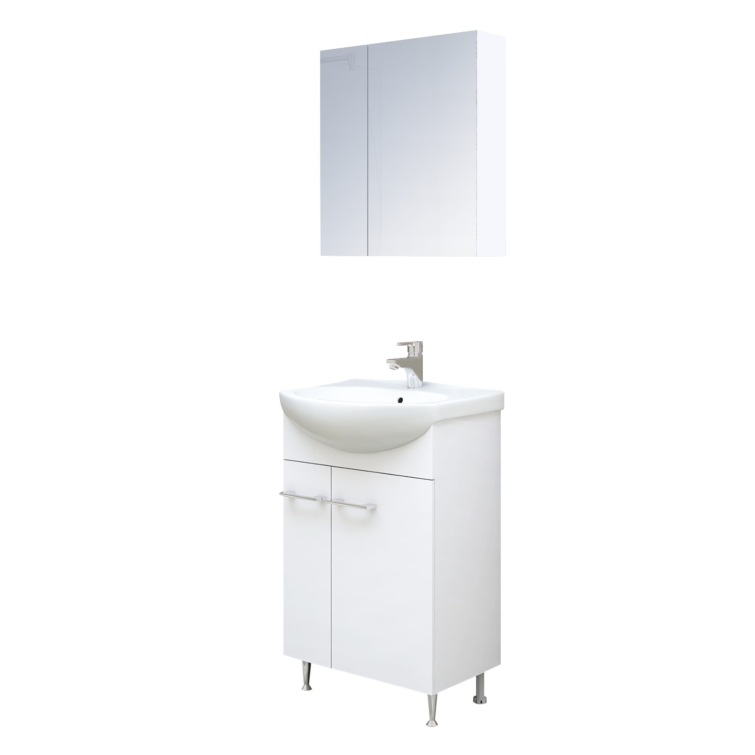Практичен водоустойчив комплект шкафове за баня с две врати и плавно затваряне и горен шкаф с огледало.