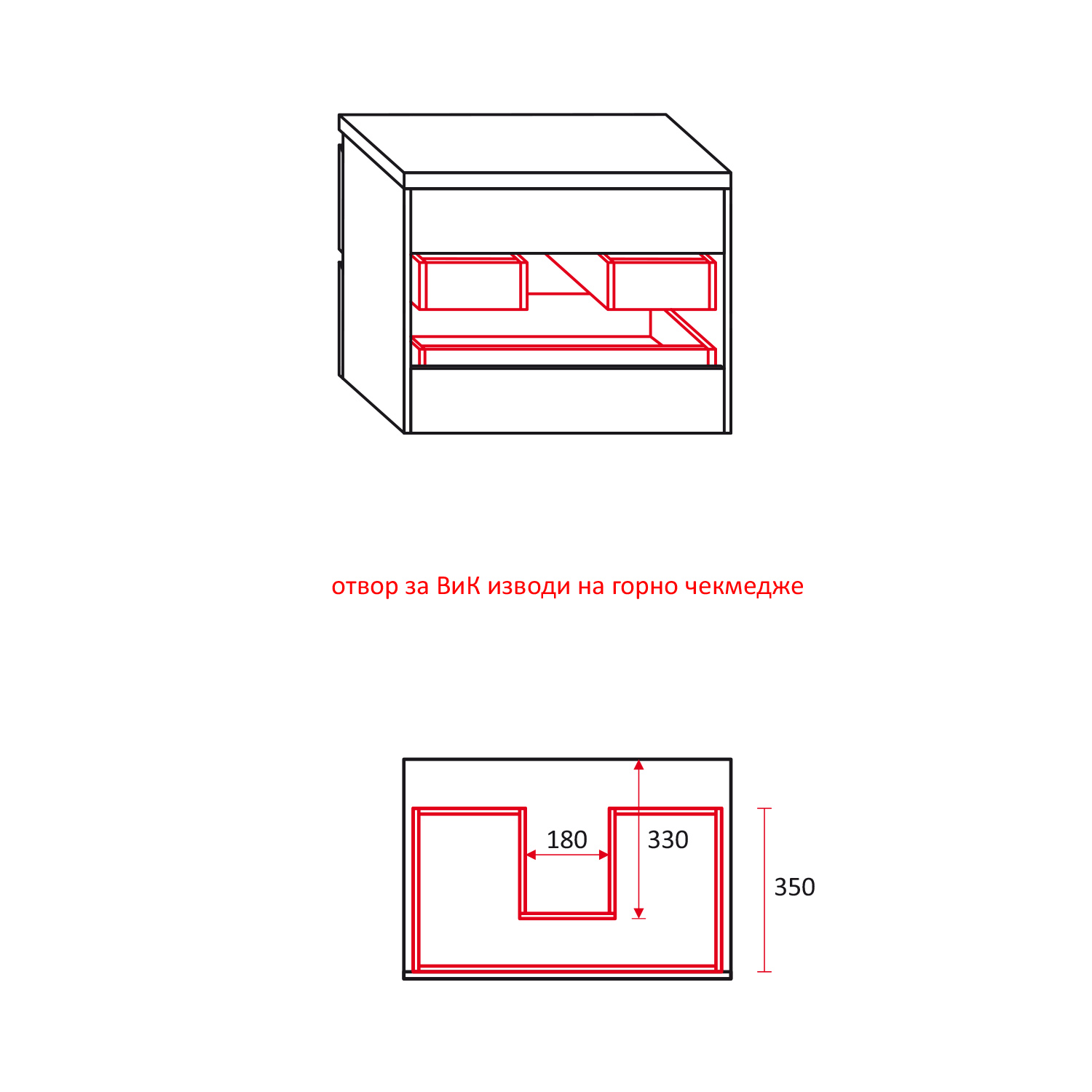 Шкафът се доставя сглобен, готов за монтаж с включени всички необходими крепежни елементи и с цял плот, без фабрично пробит отвор. Отворът следва да се изреже според конкретния модел мивка, като е задължително да се спазят инструкциите за монтаж на мивка тип „купа“, налични по-долу и приложени в печатна форма към всеки шкаф.