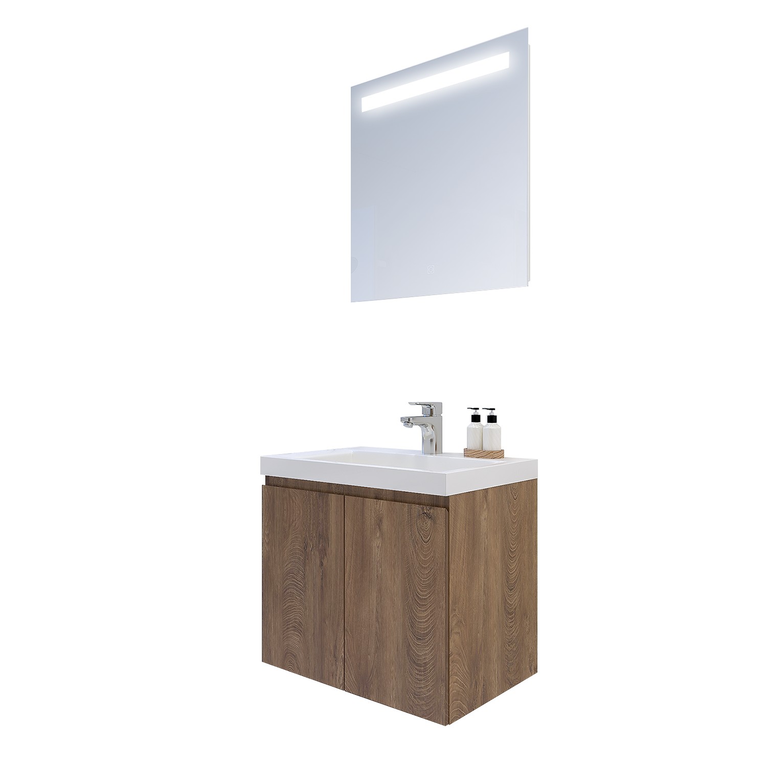 Стилен и практичен водоустойчив комплект шкафове в модерен дървесен цвят! Включва огледало с LED осветление.