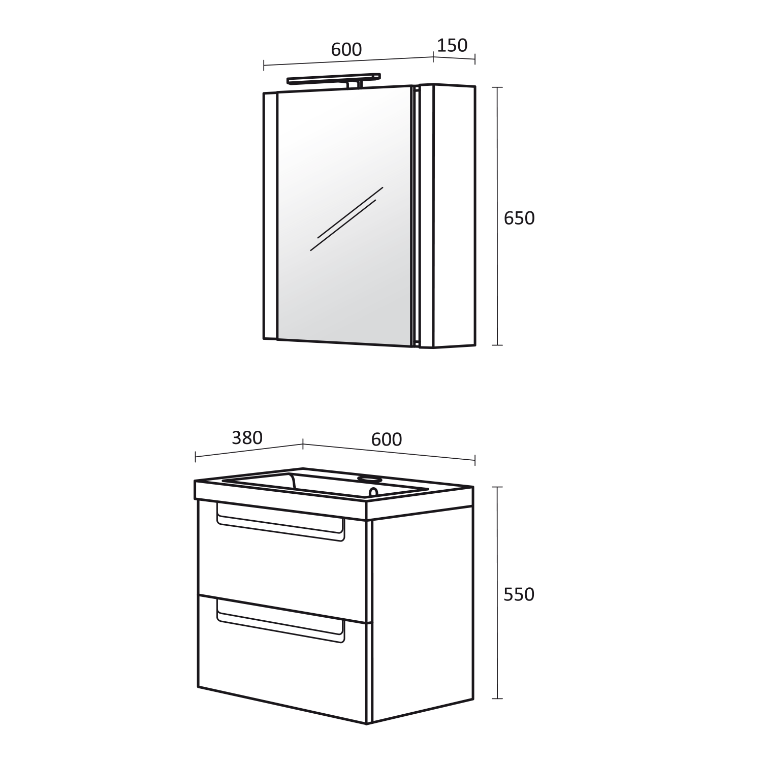 - Размери в мм: Ш – 600 / В – 550 / Д – 380