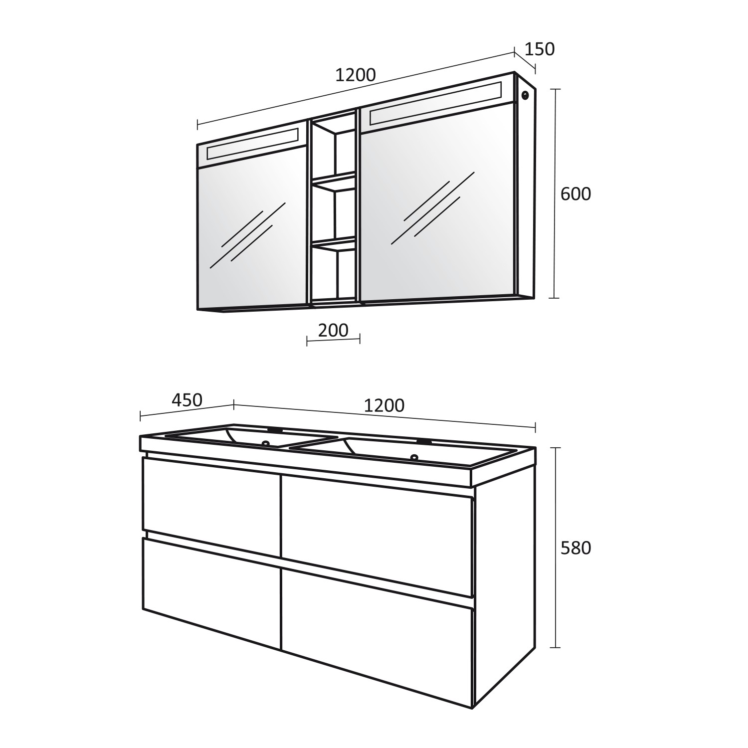 - Размери в мм: Ш – 1200 / В – 580 / Д – 450