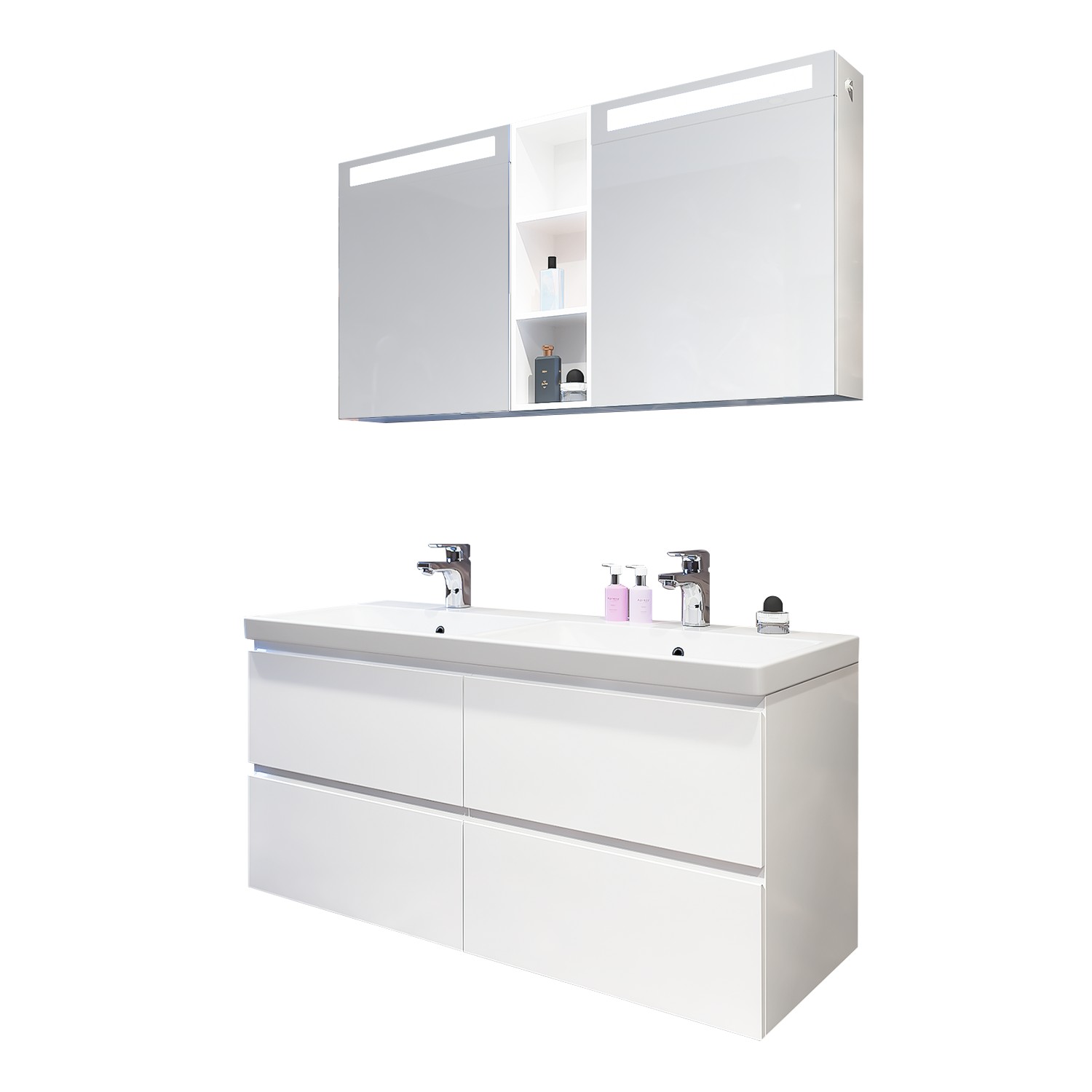 Шкафовете се доставят сглобени и готови за монтаж с включени всички необходими крепежни елементи. Поради големината и тежестта мивката е опакована отделно.