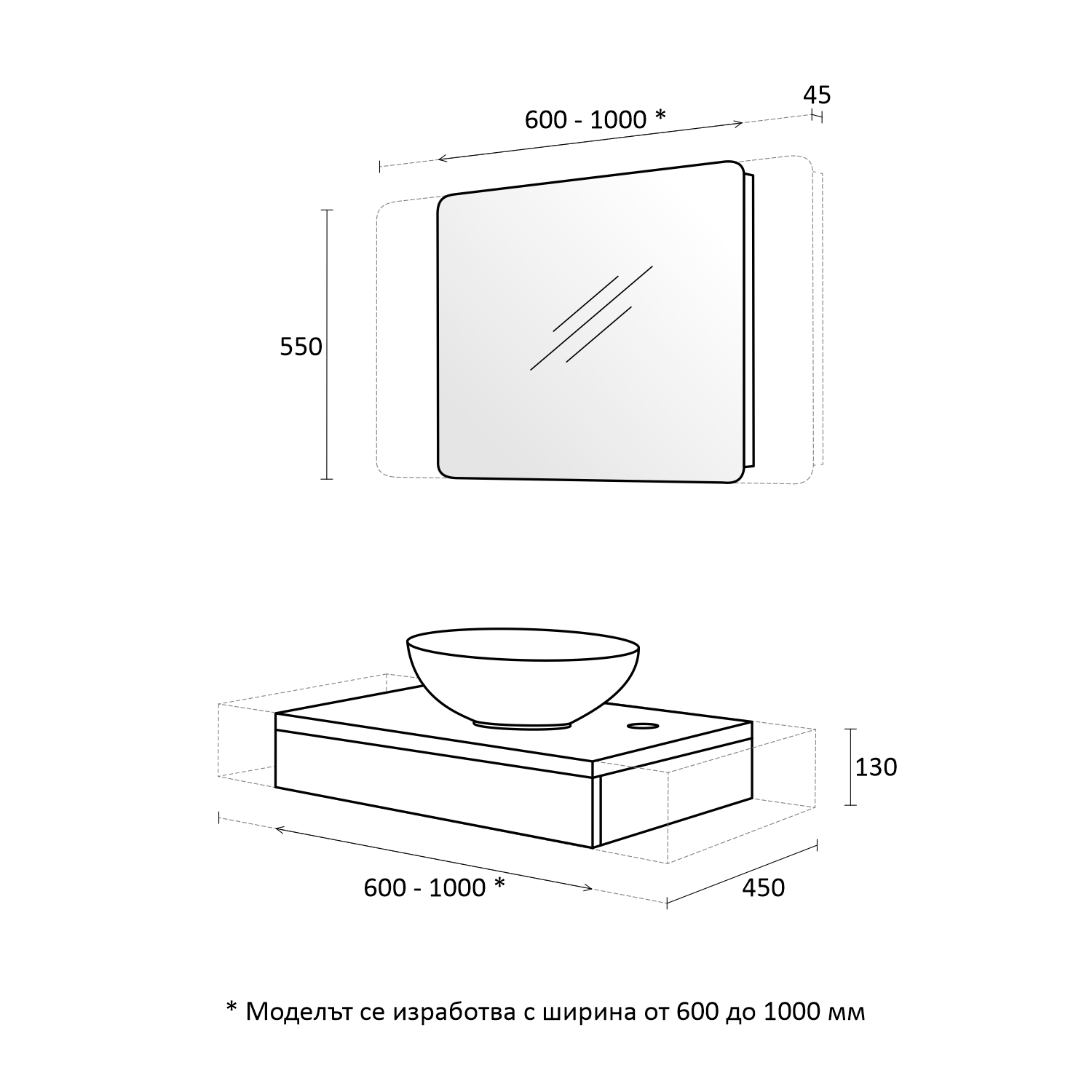 **При увеличаване размера на плота, се увеличава и размера на огледалото.