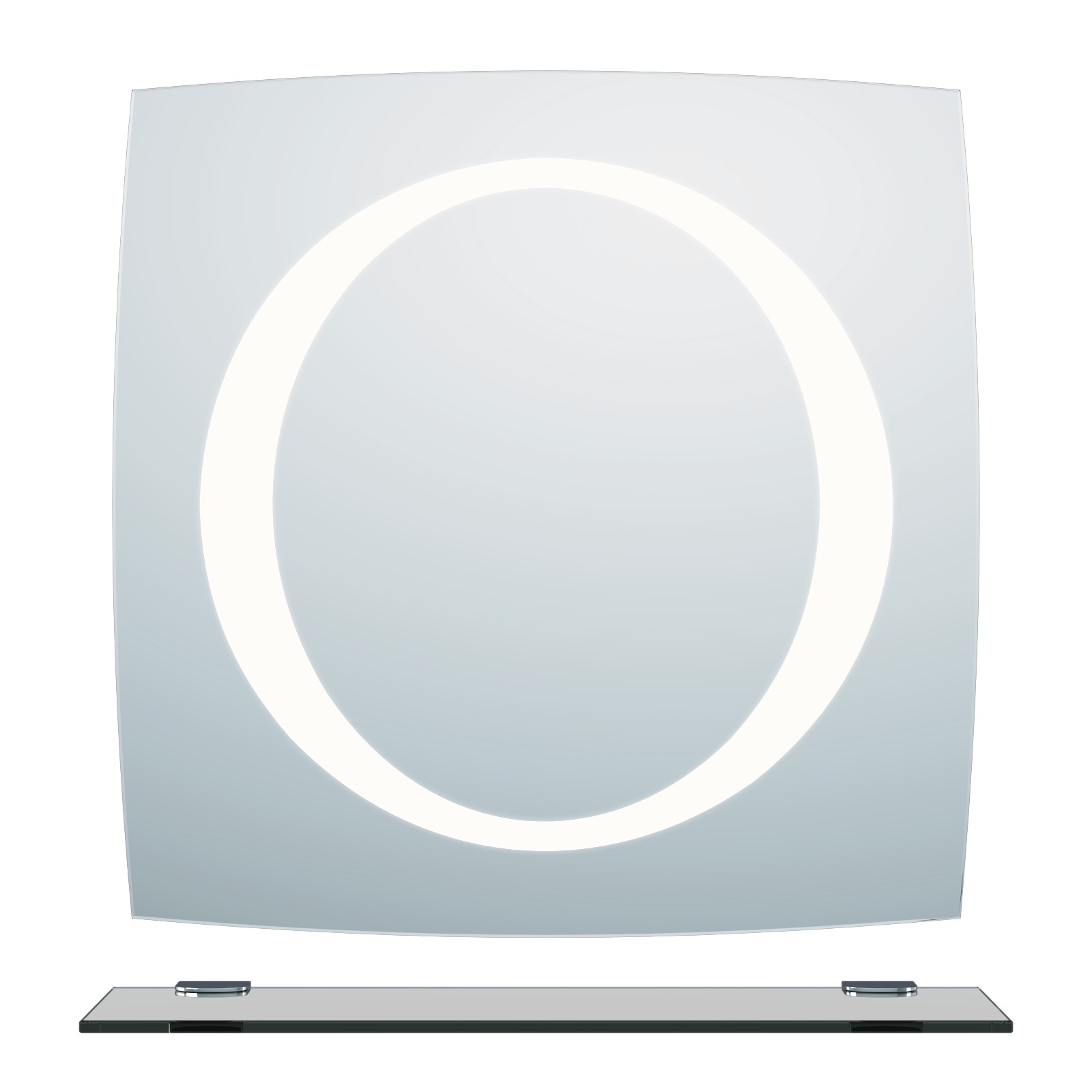 Стилно огледало с вградено LED осветление и стъклена полица, предлагаща допълнително място за козметика и тоалетни принадлежности.
