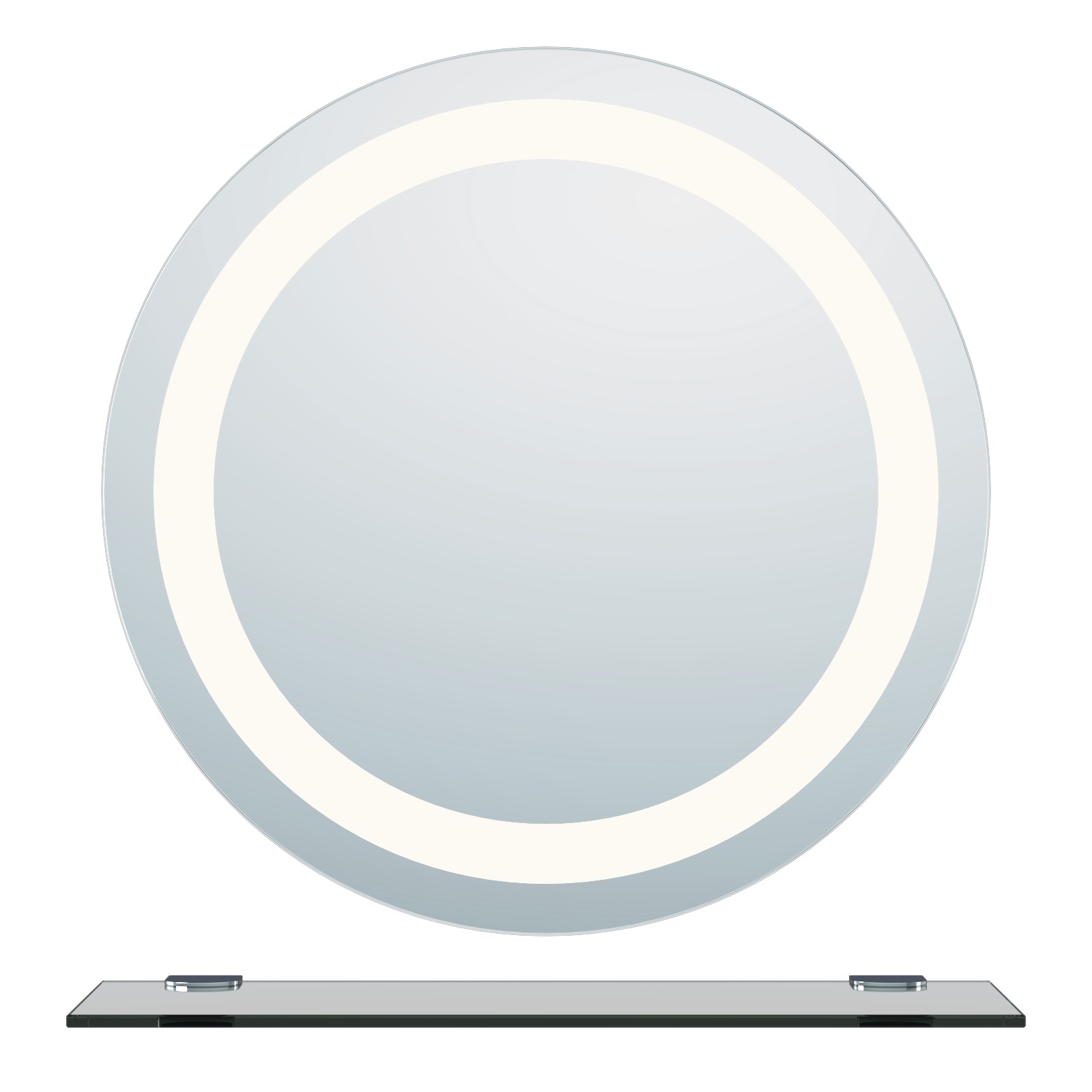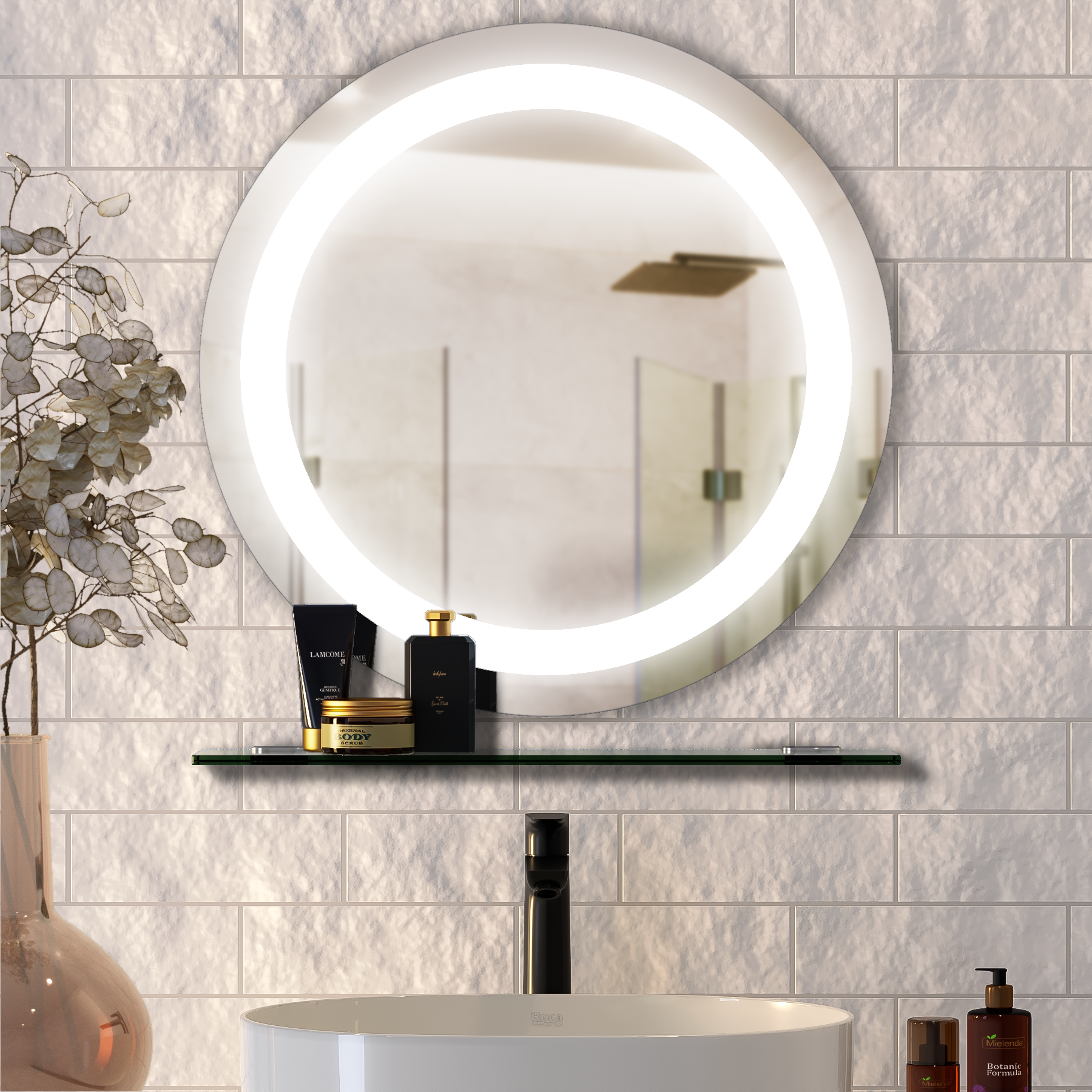 Модерно кръгло огледало с вградено LED осветление и стъклена полица, предлагаща допълнително място за козметика и тоалетни принадлежности.